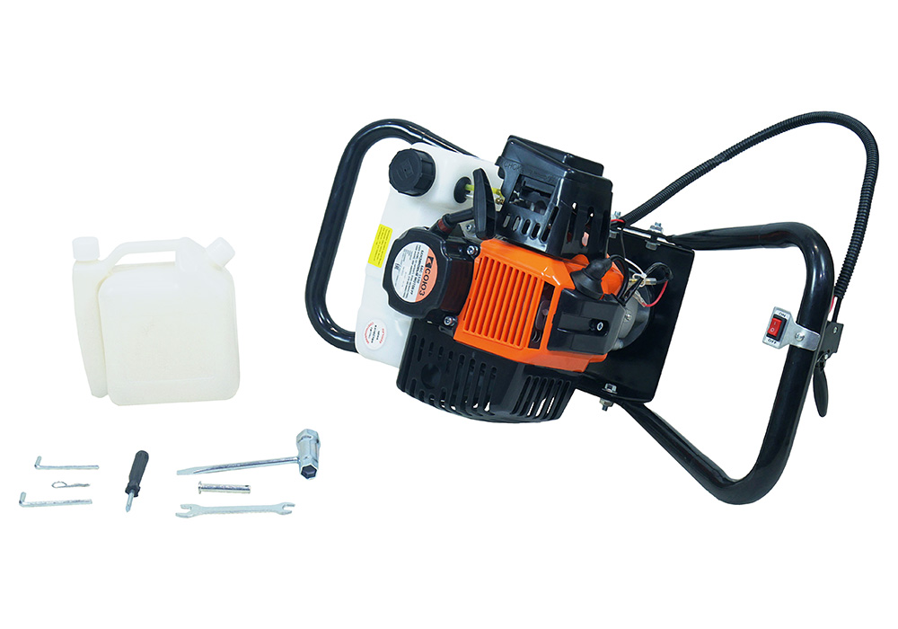 Мотобур, емкость для смешивания топлива, разъёмный палец, стопорный штифт, болт с гайкой для крепления рукояток (8шт), двусторонний гаечный ключ, торцевой ключ с крестовой отверткой, шестигранный ключ (2шт). отвертка, инструкция по эксплуатации