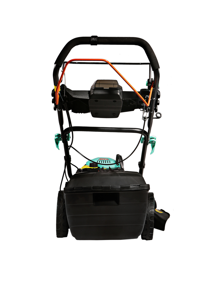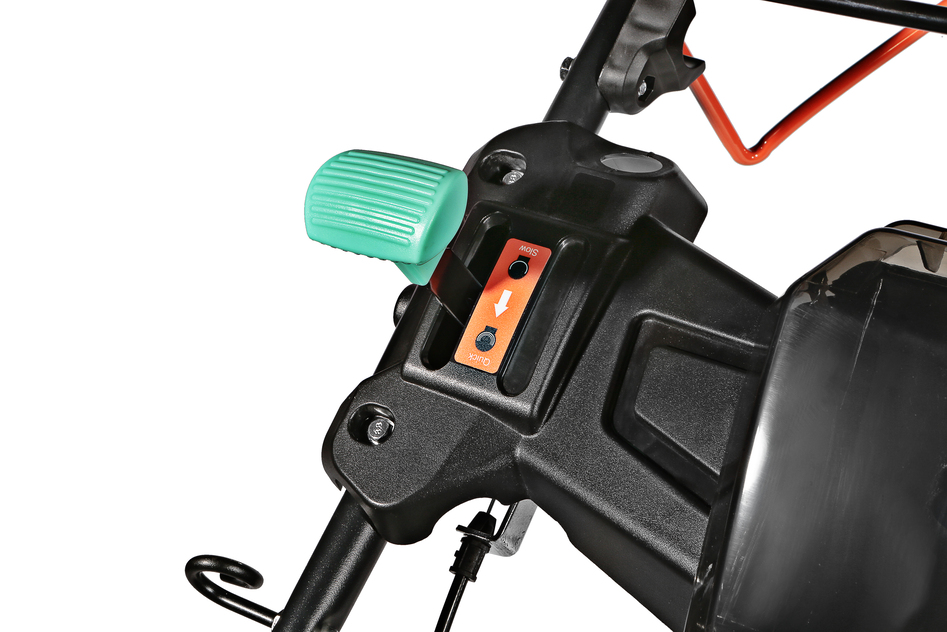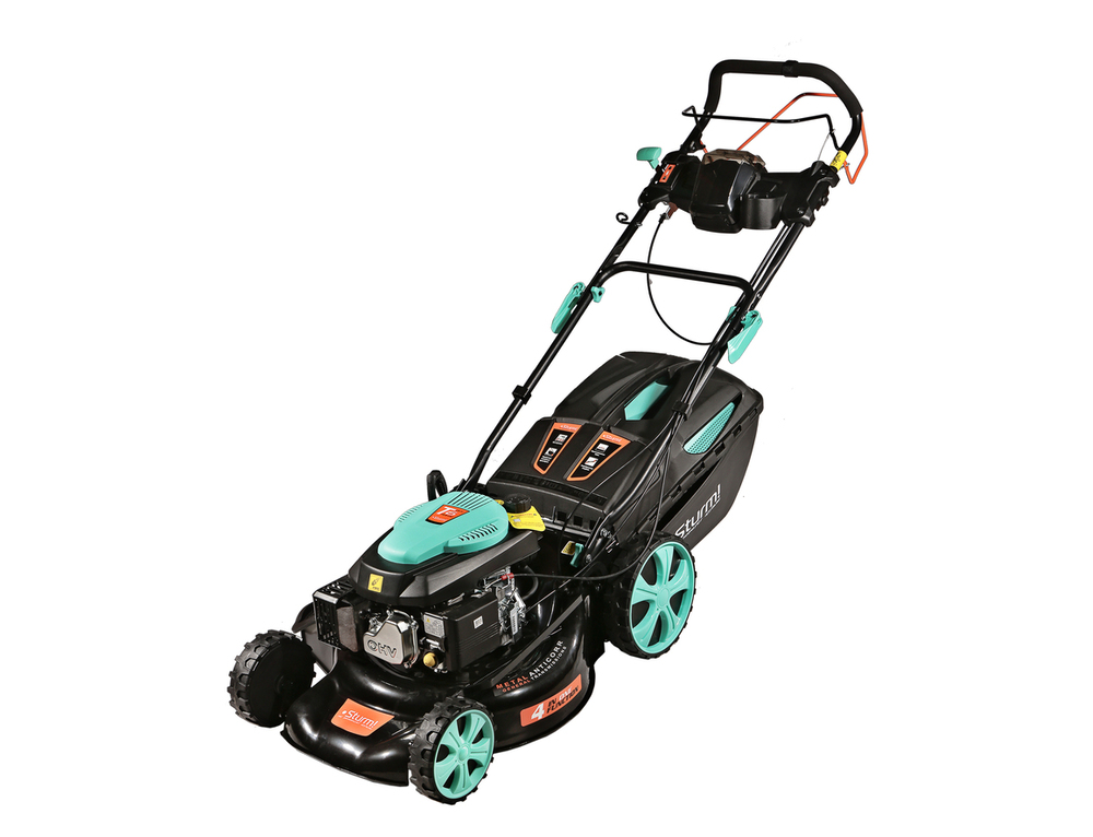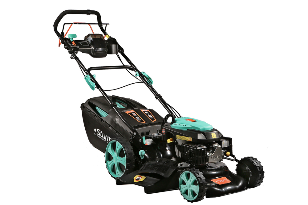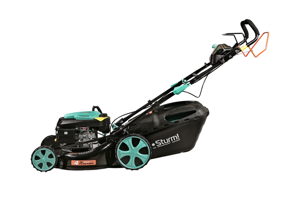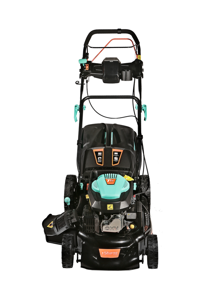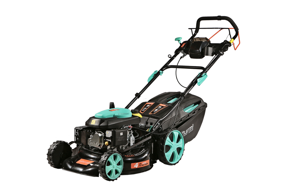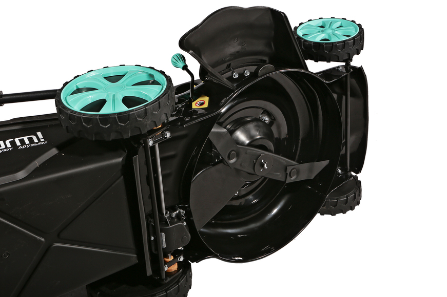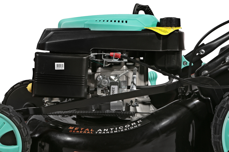 Управление оборотами двигателя осуществляется с помощью удобного рычага на верхней рукоятке, позволяя настраивать нужную скорость движения. Установленная трансмиссия от мирового бренда GENERAL TRANSMISSIONS обеспечивает самостоятельный привод задних колес и снимает физическую нагрузку с оператора. Центральная регулировка высоты кошения — быстрая и удобная настройка с помощью одного рычага облегчает обработку газонов с изменяющимся рельефом. Конструктивная схема 4 IN ONE Function предусмотривает четыре способа утилизации травы: задний выброс, сбор в травосборник, боковой выброс, мульчирование. Надежная стальная дека со специальным антикоррозийным покрытием MetalAnticorr и штуцером подключения шланга для промывки изнутри надолго сохранит свои свойства и внешний вид. Легкий и вместительный 60-литровый травосборник из ударопрочного ABS-пластика создает дополнительные удобства в обслуживании и экономит время операций. Большие кол