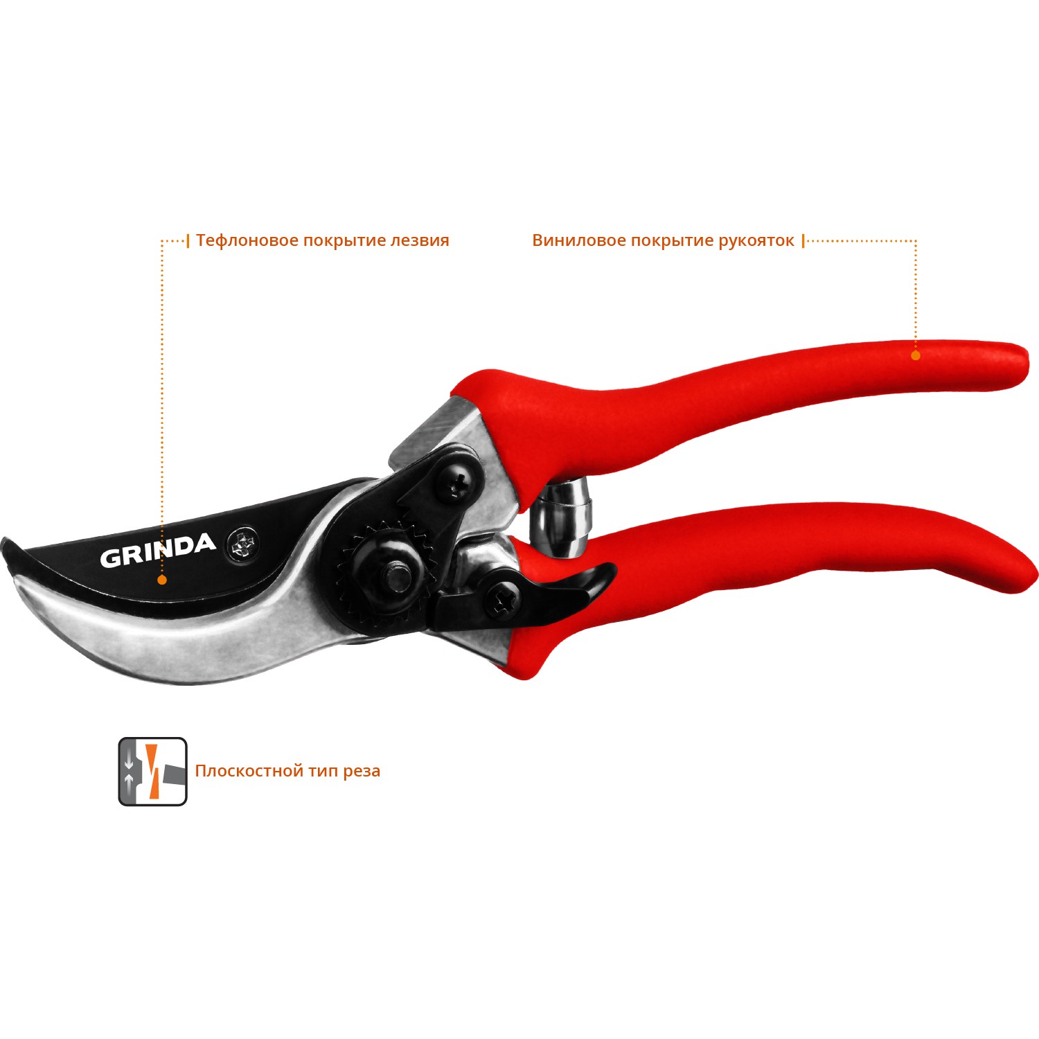 GRINDA G-26, 205 мм, углеродистая сталь, закаленные лезвия, тефлоновое покрыт., двухкомпонентные пластиковые рукоятки, плоскостной секатор (8-423102)