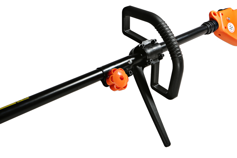 Триммер (двигатель с верхней штангой и коннектором) Штанга нижняя с редуктором Защитный кожух Рукоятка D-образная Шпулька с леской Трех лопастной нож Плечевой ремень Винт (2шт) Шестигранный ключ (2шт) Комбинированный ключ